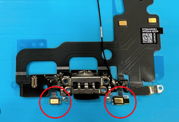 iPhoneのマイクは充電口の左右にあり、赤丸で囲んだこの金色の部分がマイクです。